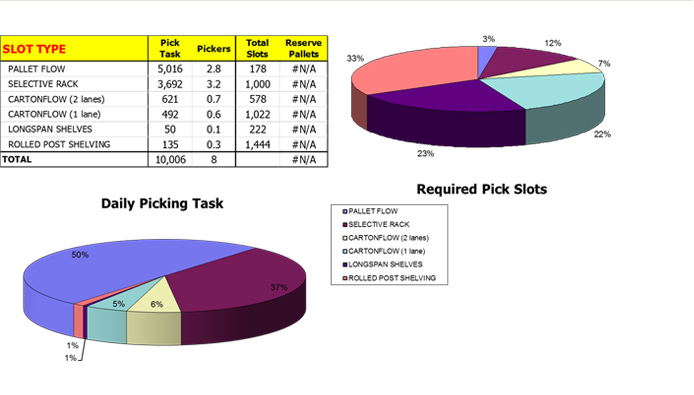 - Product Slotting- Utilising Optislot we can also demonstrate the operation efficiencies to be realised by not just selecting the correct picking technology but also by placing your products in the correct pick location.
